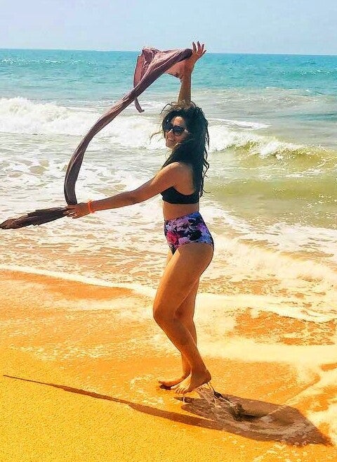 TV actress Riddhi Dogra looking so gorgeous flaunting her milky white figure in floral bikini panty and black bra having fun in a beach.