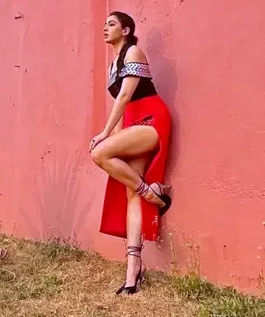 Sara Ali Khan flaunting her milky hot beautiufl legs and thighs in red and black long skirt in the outdoor photoshoot. She is looking gorgeous. Bollywood actress hot legs. Indian actress hot thighs and legs photos.